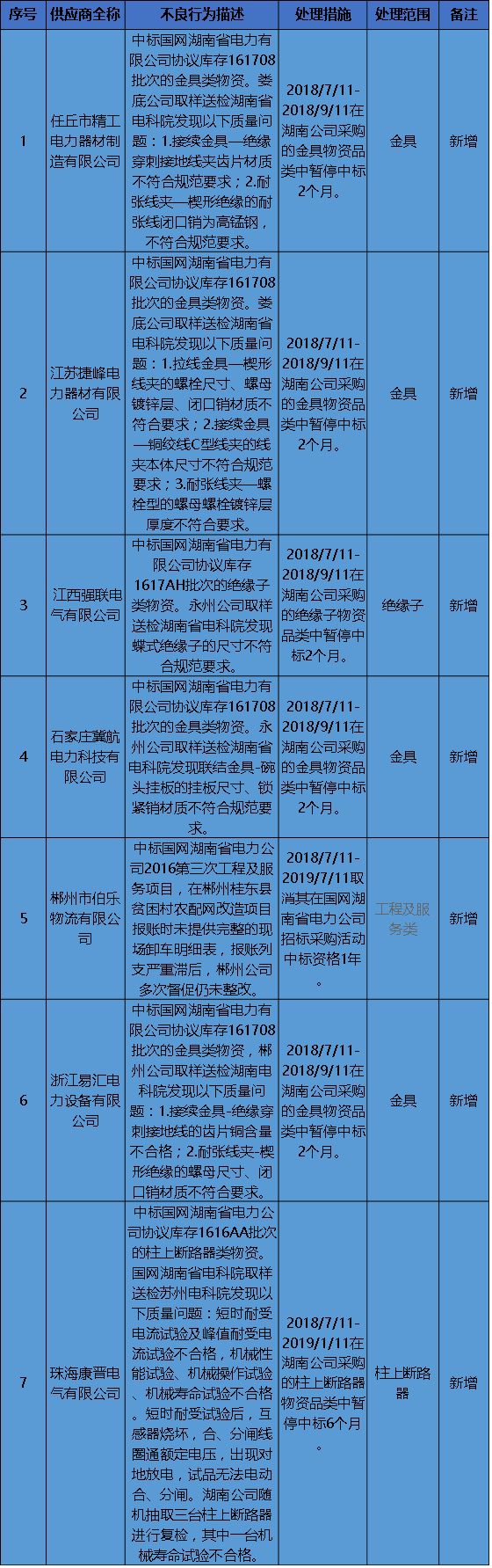 供应商不良行为处理自公示之日起执行,在处罚期间没有相应产品招标批次的,处罚时间顺延。请供应商认真查找问题原因并积极整改,在整改完毕后将整改报告提交至国网湖南省电力有限公司物资公司质量部。